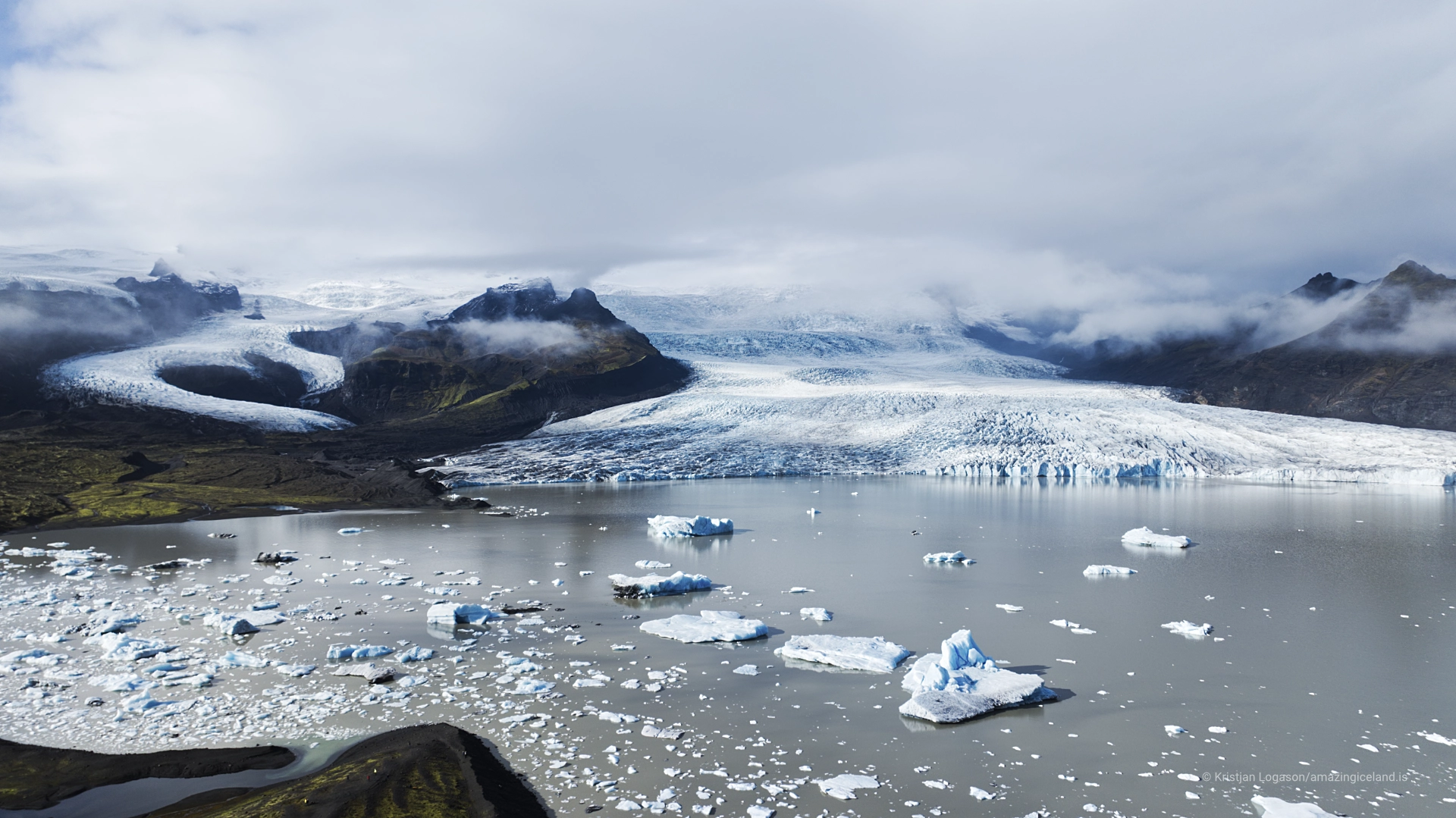The surrounding terrain—moraines, outwash sediment, and exposed bedrock—frames the lagoon without softening it. Vegetation is sparse, and the landscape remains transitional, emphasizing that Fjallsárlón exists in a state of adjustment rather than equilibrium.