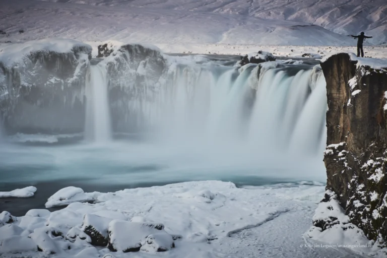 Seasonal variation is pronounced. In summer, glacial melt increases flow and enhances the waterfall’s breadth and soundscape. In winter, partial freezing introduces sculptural ice formations along the basalt edges, shifting emphasis from movement to form. Both conditions are valid expressions of the site, and neither should be considered secondary.