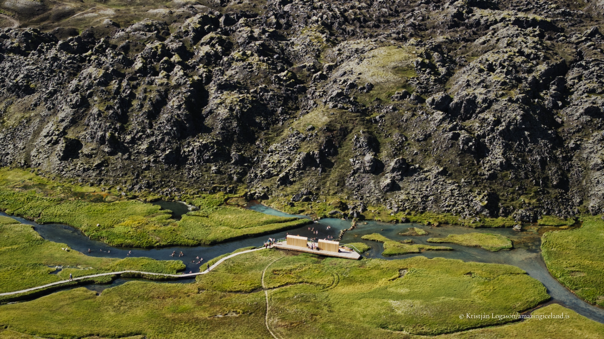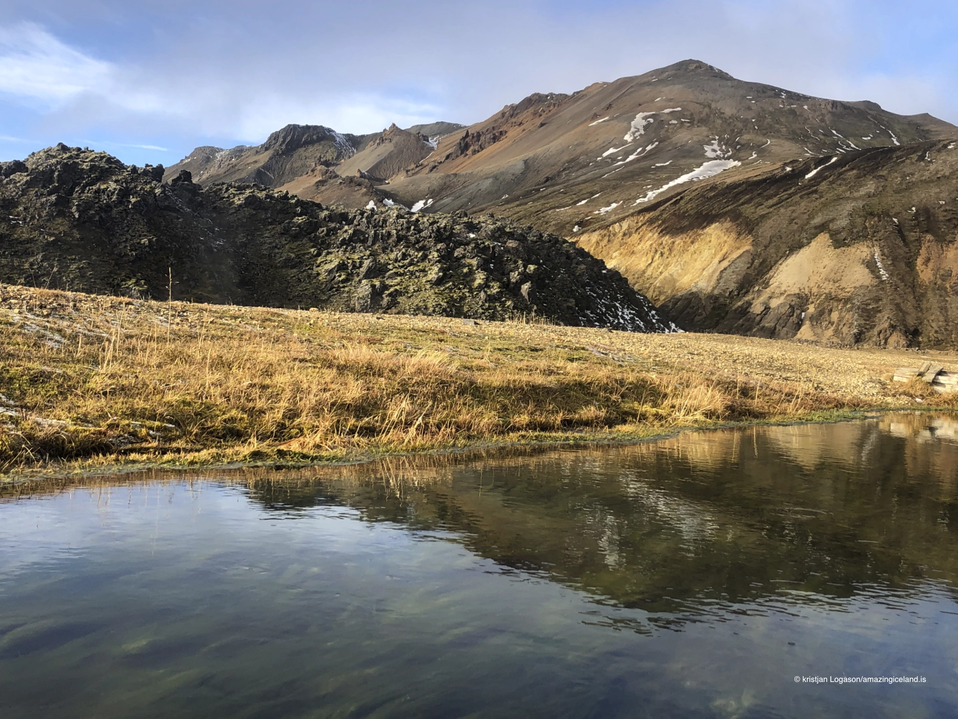 Laugahraun plays a crucial role in shaping the Landmannalaugar basin. It forms a dark boundary along the edge of the geothermal area and directly influences the movement of water and people through the site. The well-known natural hot spring at Landmannalaugar emerges at the interface between the lava field and softer sediments, where permeability differences allow geothermal water to surface and mix with cold streams.