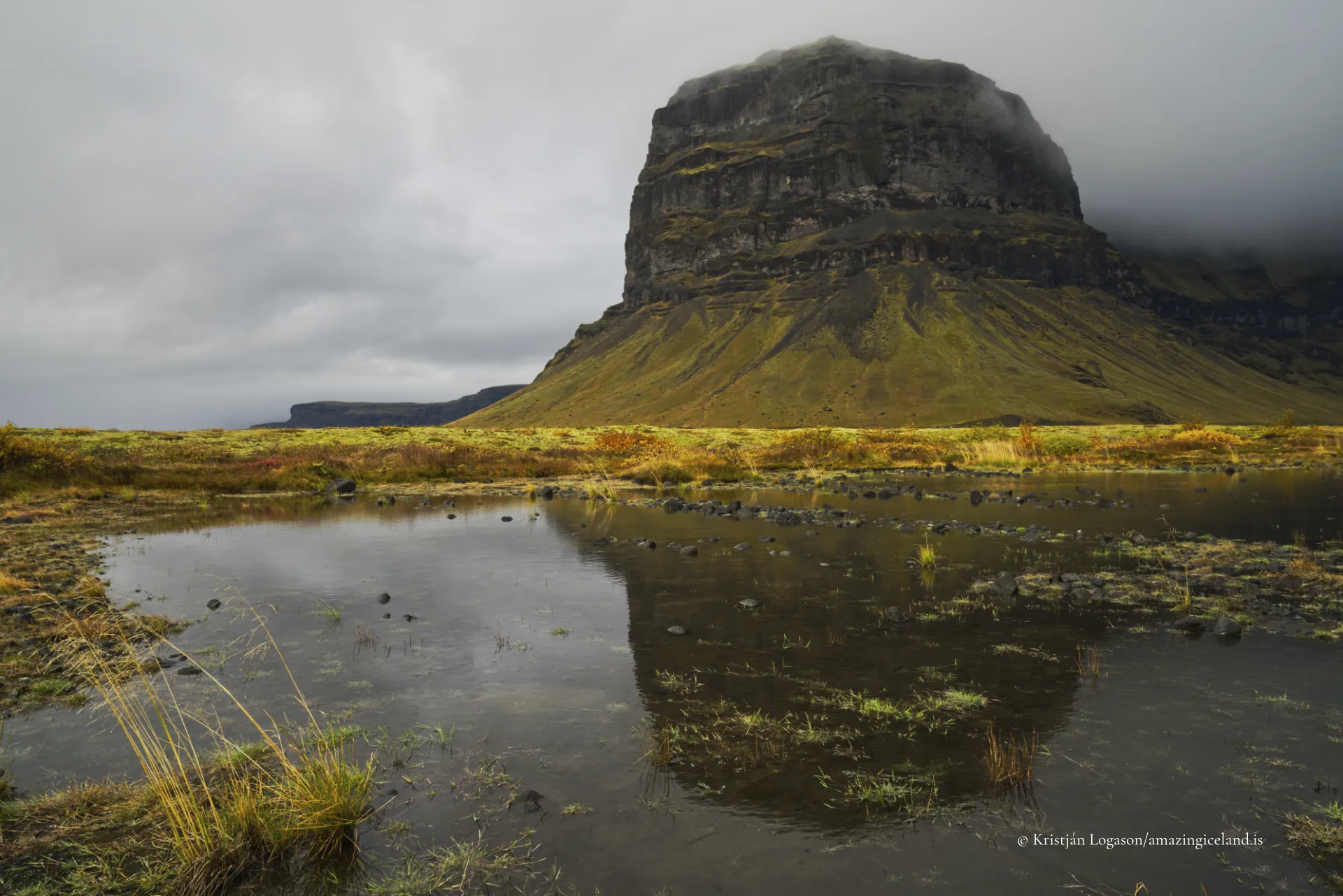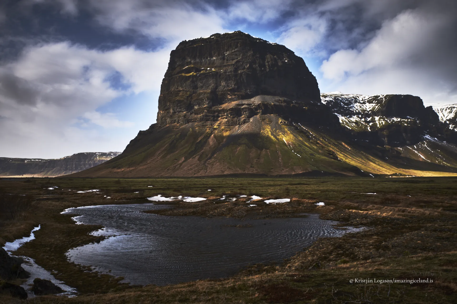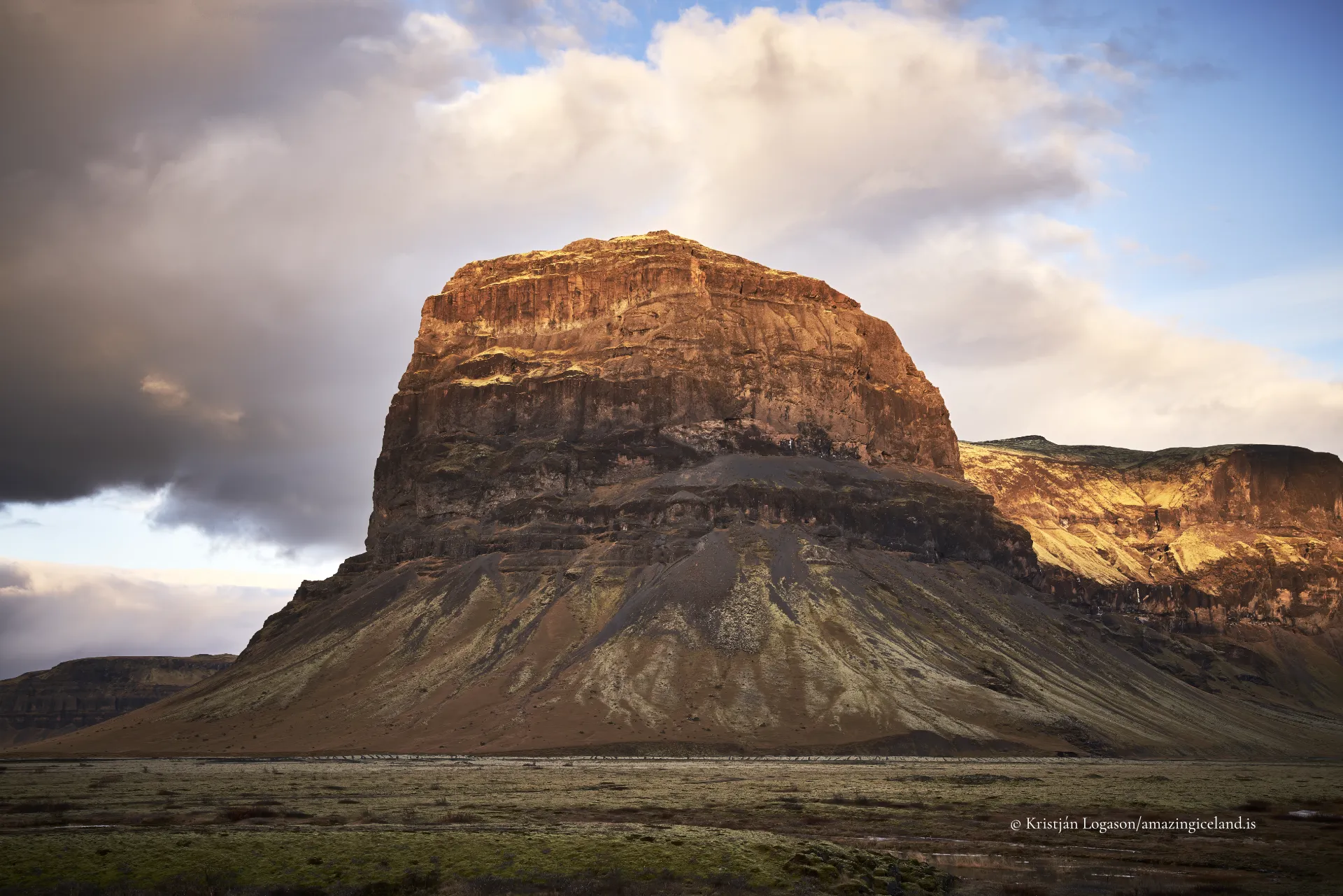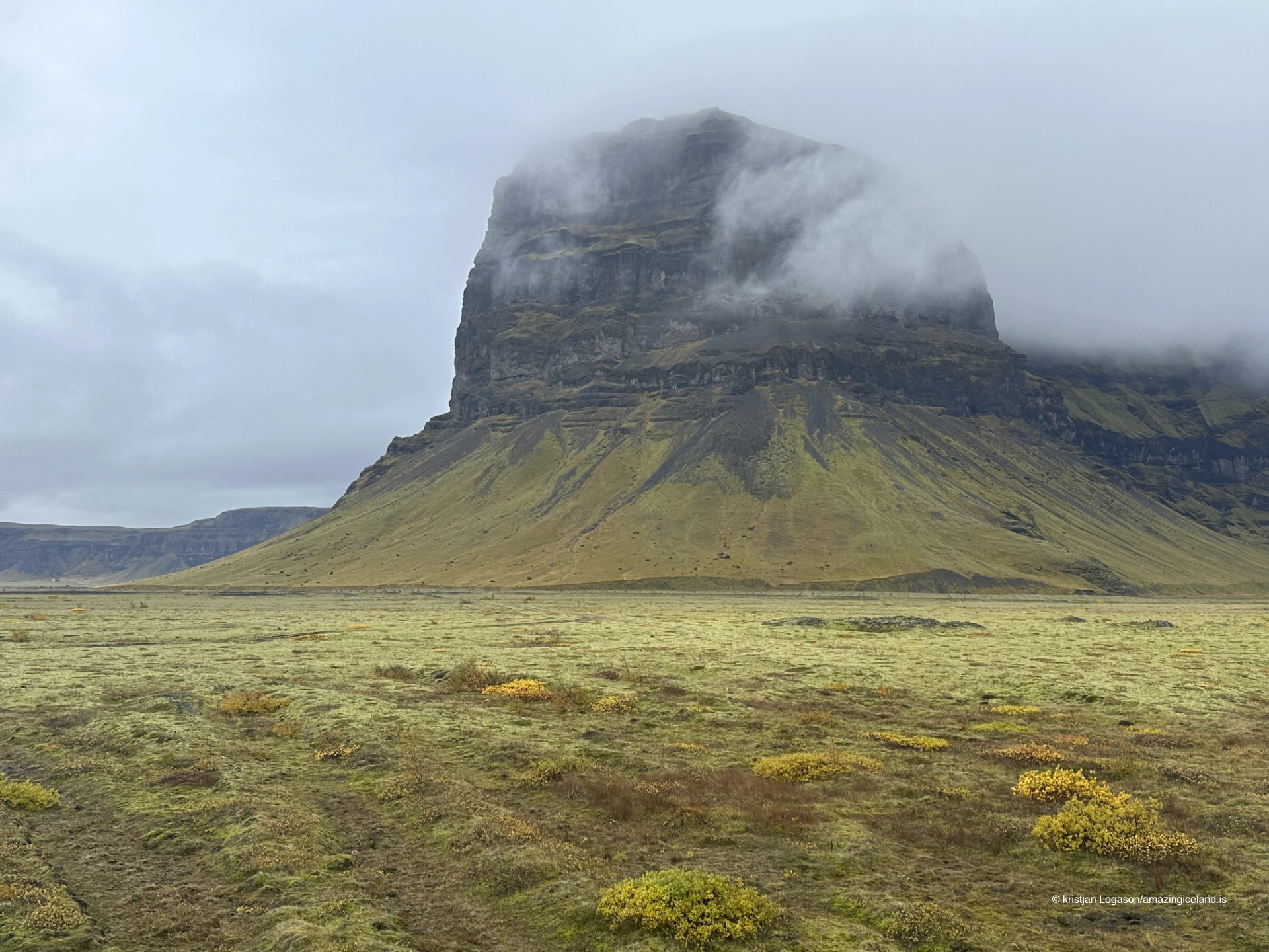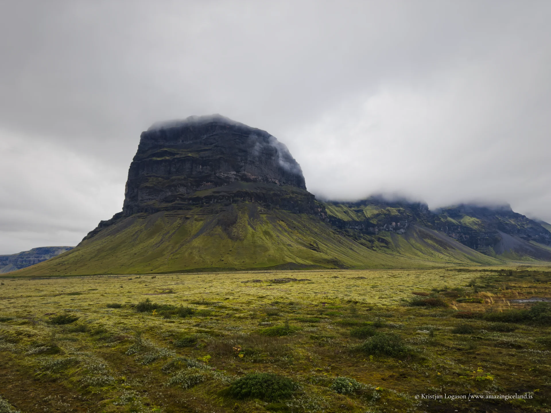Seasonal conditions alter how Lómagnúpur is perceived. In summer, low-angle light emphasizes the texture of the cliff face, revealing subtle color variation within the basalt layers. Clouds often interact with the upper slopes, partially obscuring the top and reinforcing the mountain’s vertical dominance.