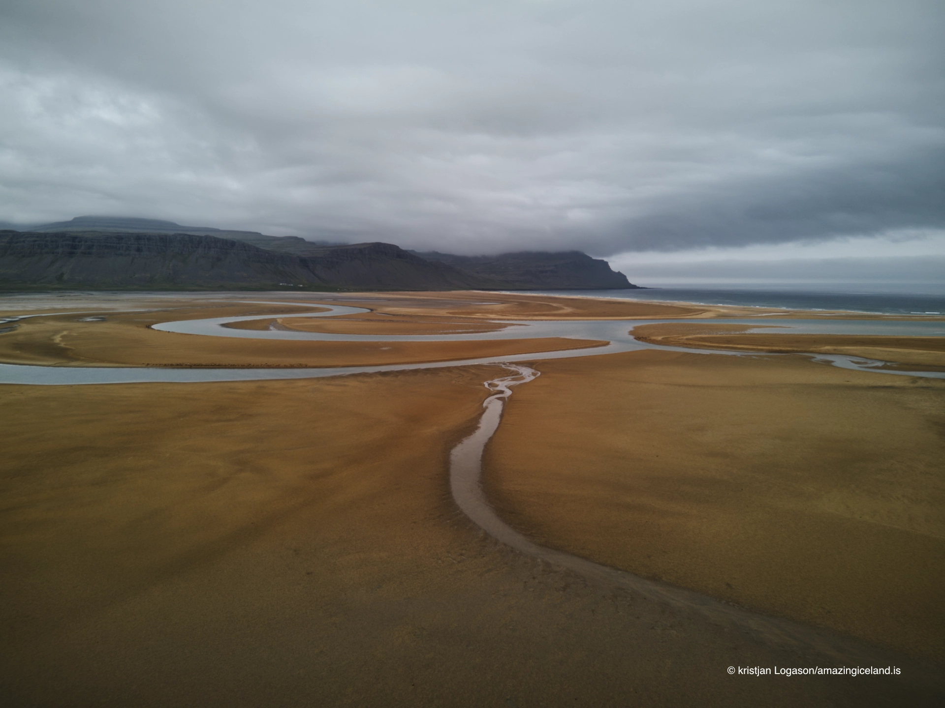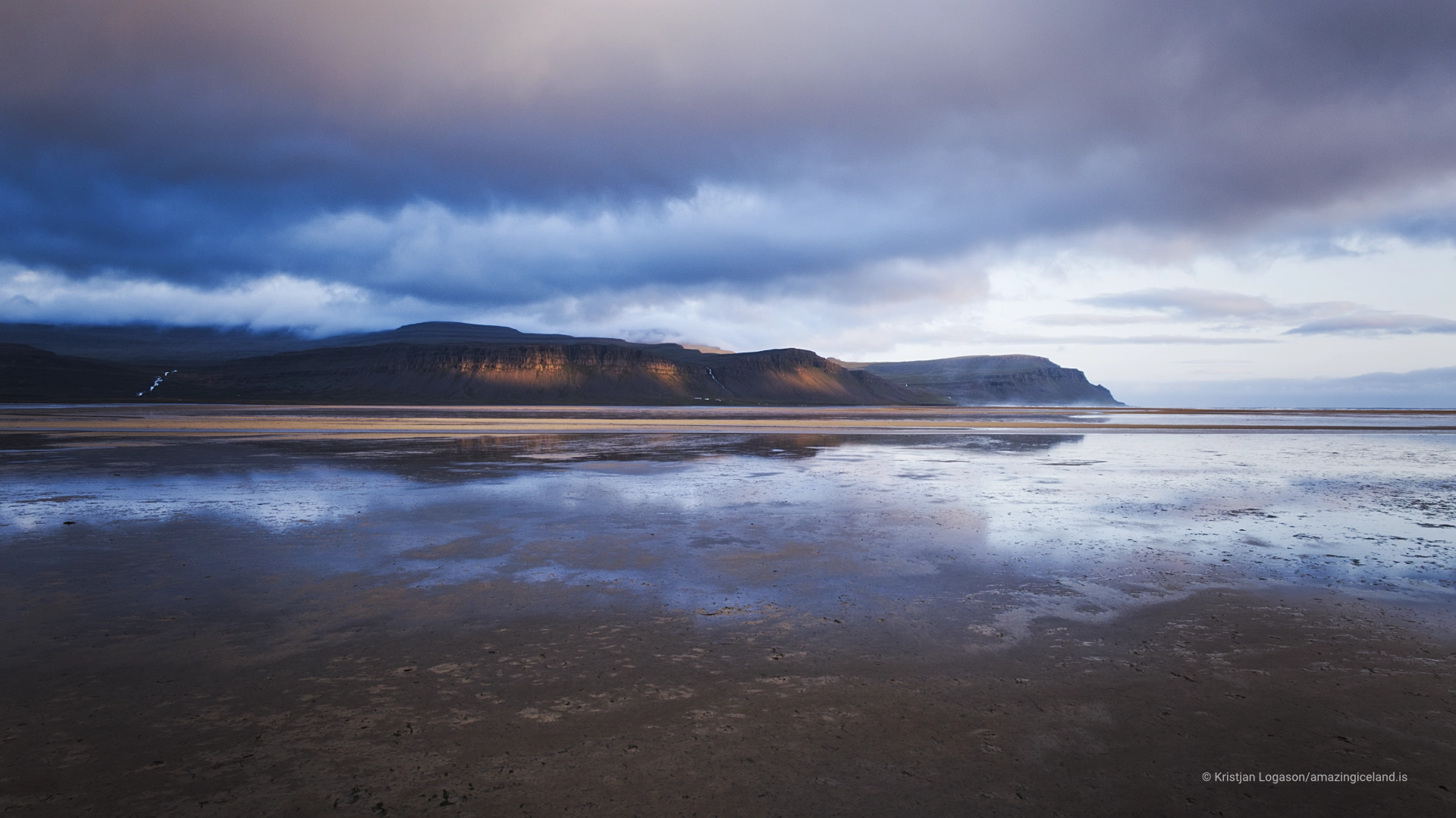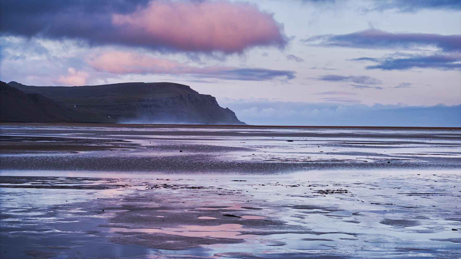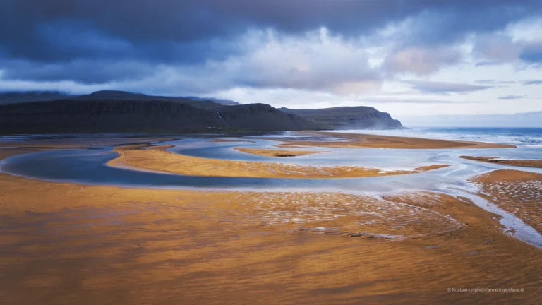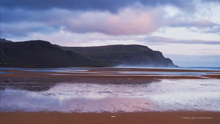 On the southern edge of the Westfjords, Rauðisandur extends for several kilometers along an open bay, facing the North Atlantic. Unlike Iceland’s dark volcanic beaches, Rauðisandur’s fine, mineral-rich sands and broad intertidal zone create a coastal environment defined by color variation, low relief, and a strong sense of spatial openness.