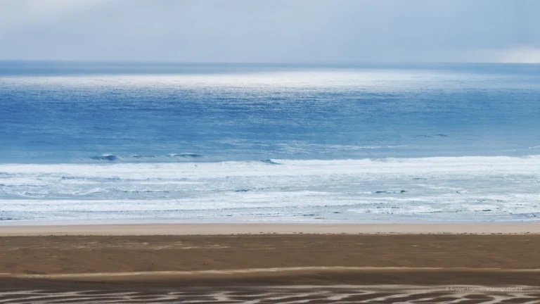 This exposure also governs conditions. Weather systems move across the bay with little obstruction, and wind can reshape surface patterns within hours. Tidal variation is pronounced, and the distance between high and low tide can be substantial. At low tide, the beach expands into a wide, reflective plain; at high tide, the sea advances quietly, compressing the shoreline back toward the dunes.