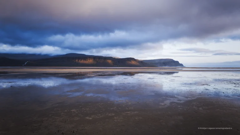 Rauðisandur is located south of the Látrabjarg cliffs, forming a long, gently curving shoreline backed by low dunes and steep mountain slopes. The beach stretches for approximately 10 kilometers, making it one of the longest continuous sandy beaches in Iceland. Its width and shallow gradient produce an expansive intertidal zone that changes character dramatically with the tide.