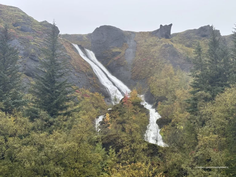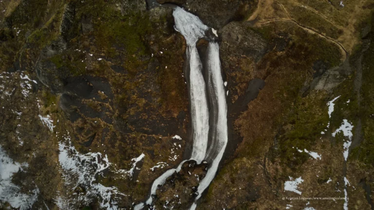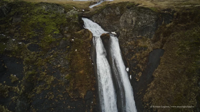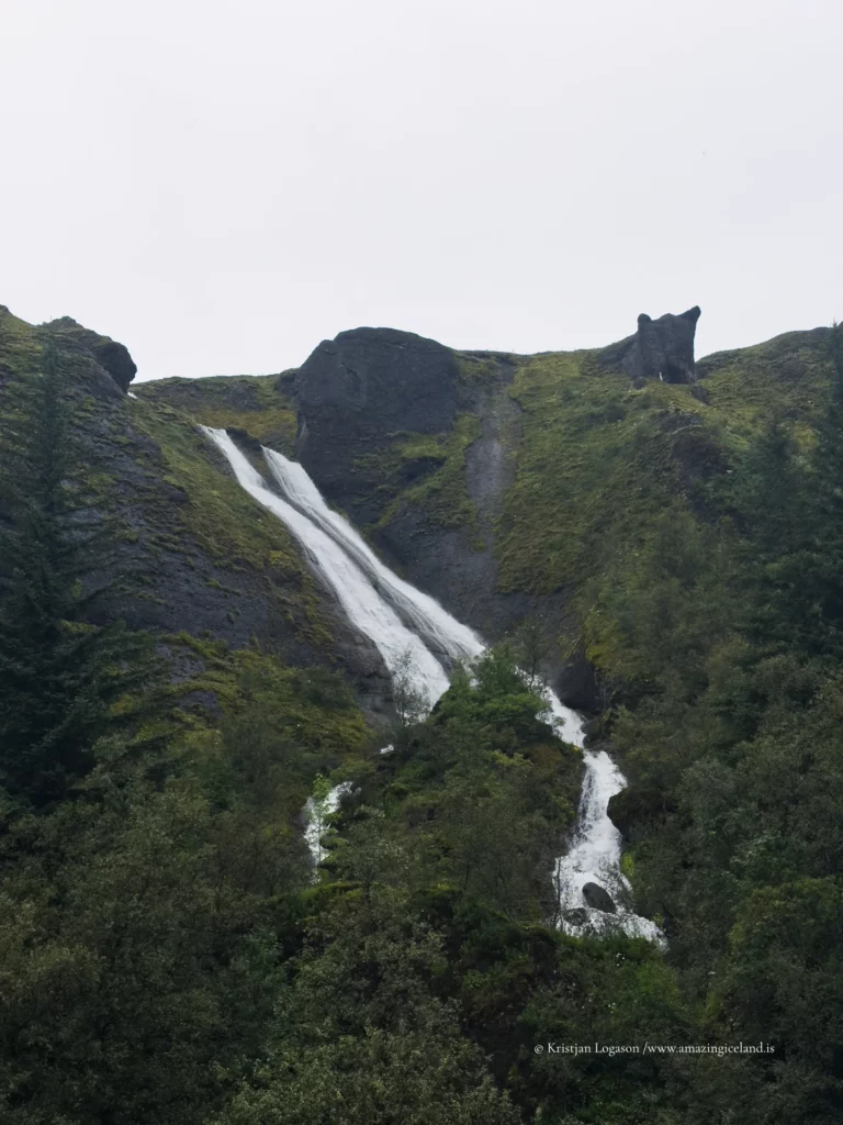 The waterfall system consists of two main sections. The lower cascade drops in a relatively narrow stream near the edge of the village, while the upper cascade spreads wider and higher across stepped basalt formations above. Together, they illustrate how columnar basalt and layered lava flows influence water behavior: the rock fractures guide the descent, creating sharp lines, angular ledges, and a distinctly vertical rhythm. This geological structure is typical of Icelandic volcanic landscapes, where repeated lava flows cool in successive layers, later exposed by erosion.